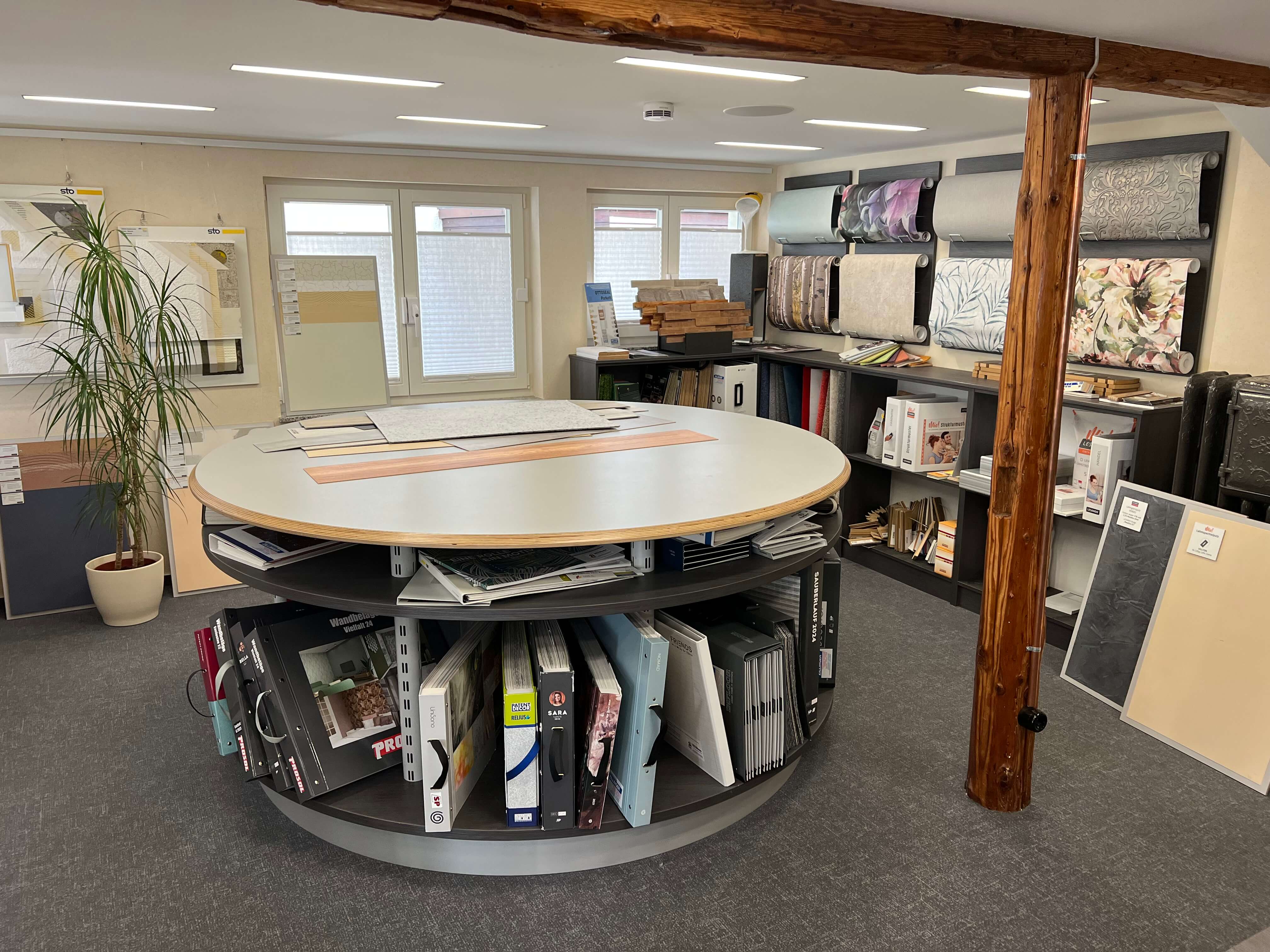 Handwerk und Ladengeschäft ergänzen sich für Sie. Neben einer großen Auswahl an Farben und Zubehör, wie Pinseln, Holzlasuren oder Naturfarben, finden Sie bei uns auch passende Tapeten und Bodenbeläge.
